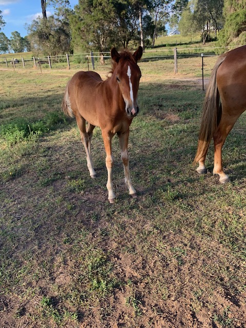 Fox Aquaria is a striking Bay Warmblood x Connemara filly by Monahan Quando Quando(Connemara) out of Fourwinds Persephone (Warmblood). She is very quiet and friendly with beautiful warmblood movement.